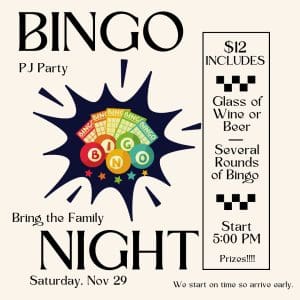 It’s that time of year again to get out of the house in your PJs and play bingo with us! We will be hosting our traditional “bottle bingo” game with chances to win prizes for all-ages. Entry fee provides a free glass of wine or beer and several rounds of bingo. Come in your best jammies and celebrate the season of family and friends.