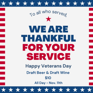 To honor all of those brave souls that have kept us safe and fought for our freedom, we cheers a glass to you! Current and past military service friends come in and enjoy beer and wine draft specials with us. Families and partners of the military receive discounts as well – we couldn’t do it without you!