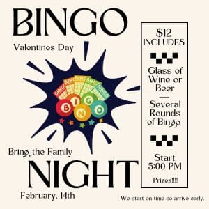 We are bringing back bingo to celebrate love and friendship on Valentine’s Day, kicking the fun  off on February 14th at 5:00 pm. The event includes several rounds of bingo and a glass of wine or beer with your entry fee of $10. Kids snack and drink options will be available and prizes and games are for all ages! The games start right on time so arrive early! No need to make a reservation but if you have more questions, email or call us!