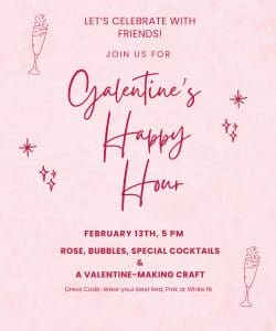 We will be hosting Galentine’s Night, which will be a great night to share love with friends and folks in the community. The event will feature bottle specials (rose and bubbles), a fun Valentine-centric craft, free snacks and fun cocktail creations. The event will start at 5 pm until close (swing over after the Market Chocolate Tasting event).